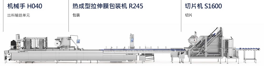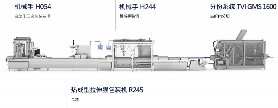 生鲜肉分切 + 机械手装填 + 包装 + 自动化包装处理